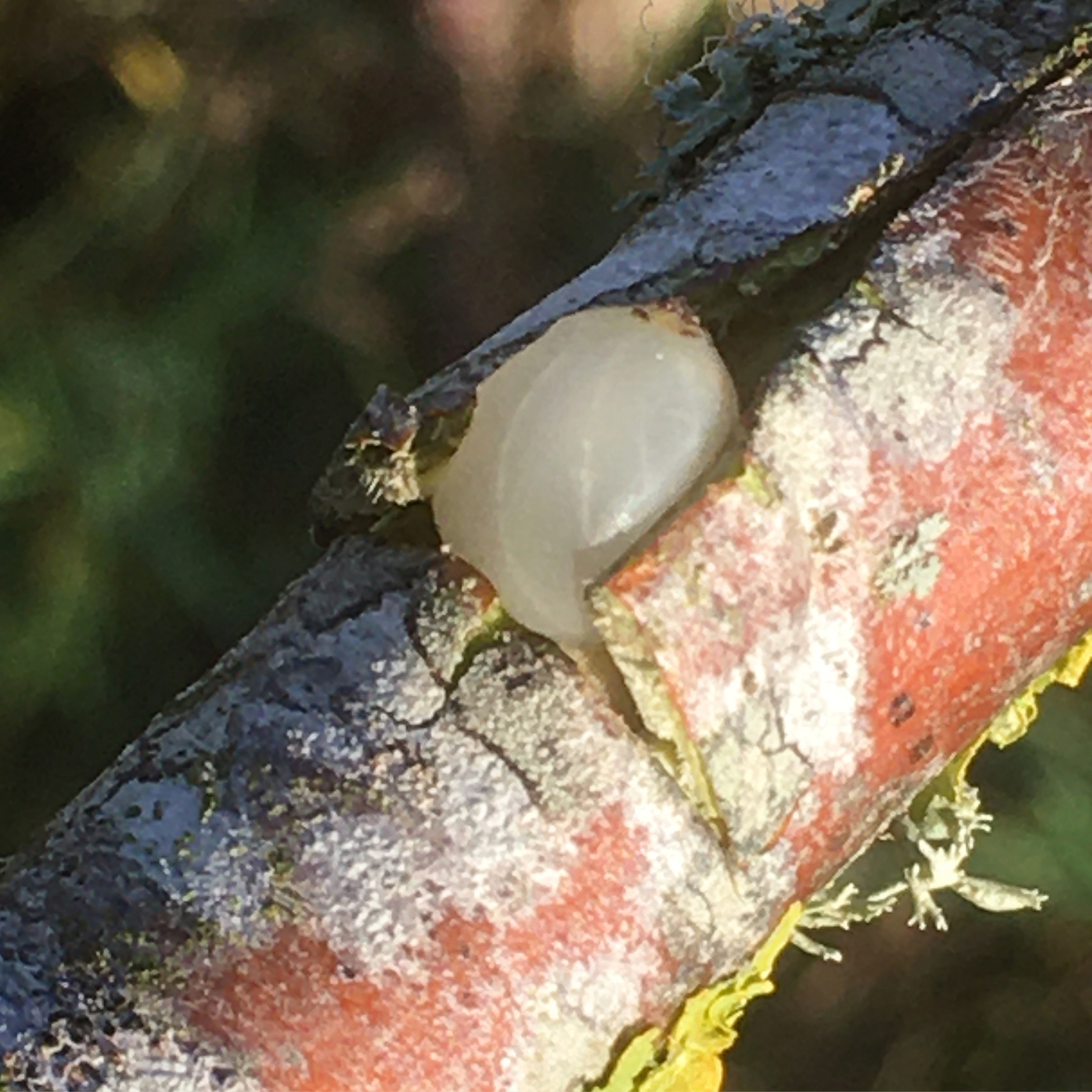 But when the sickly berries came loose and rolled around the kitchen floor like eyeballs, I reckoned it would be worthwhile and fun to see if they could be propagated. I have a few apple trees here, and crab apples grow wild in the hedge along the loaning. Hearing that mistletoe favours these trees above all others, I followed guidance and made a special trip out with a knife and a tub of parasitic seeds in my pocket.