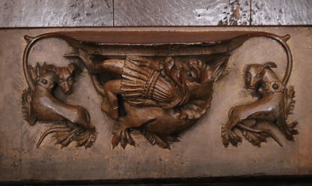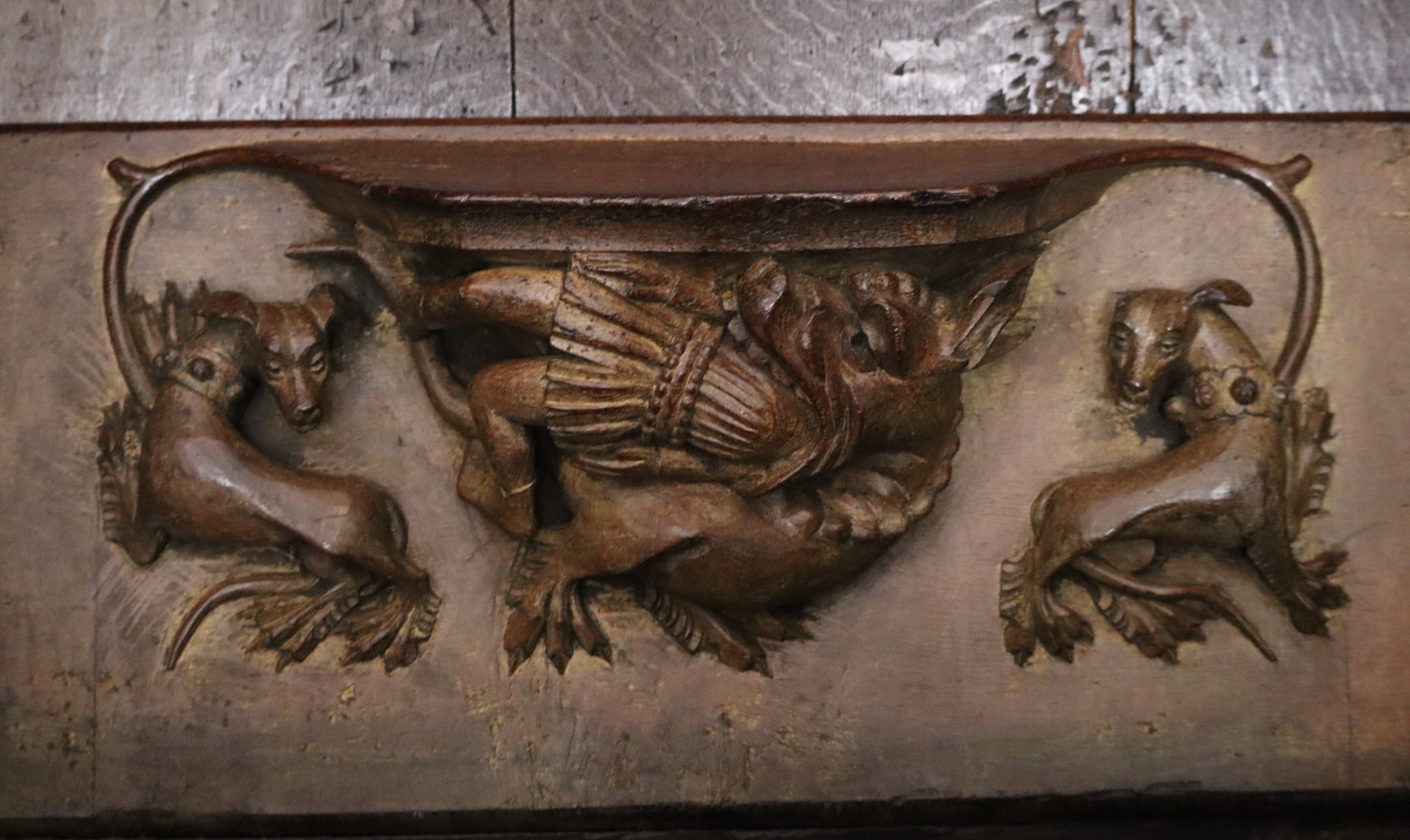The carving itself is superb, and the two “supporters” on either side are exquisitely rendered greyhounds looking back at the viewer with an expression of mute disinterest. If that’s their master being swallowed whole by the Fillgut, they don’t seem unduly perturbed by the spectacle. I loved this interpretation, but to stoke controversy, a different source has since informed me that it’s actually not Fillgut at all; merely a dragon or a wyvern. Realising that modern misericord enthusiasts can’t even agree on the most basic facts confirms a sense that while a vast store of material culture has survived from the Medieval period, much of it is madly indecipherable. If you like certain answers, this is not the subject for you – but if, like me, you’re obsessed with the word “maybe”, a whole new world awaits in the choir stalls.