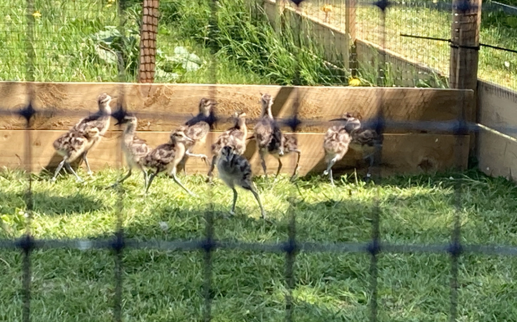 I took photographs of curlew chicks through the mesh of a pen wall. They were curious and loud in the sunshine, but they preferred to stay back from us and maintained a wary distance. Sometimes one would dash forward to grab an insect which had risen from the grass, and there would be an audible click of its beak closing upon it. They only had short beaks, and nothing which had begun to bend downwards like an adult bird. These are simply chopsticks, but in time they’ll grow long and supple and the birds will probe at depth in the foreshore mud for ragworms and luggers. But for now, most of their nourishment is obtained from trays of crumb and pellet, and the percentage intake of protein is carefully monitored by professionals.