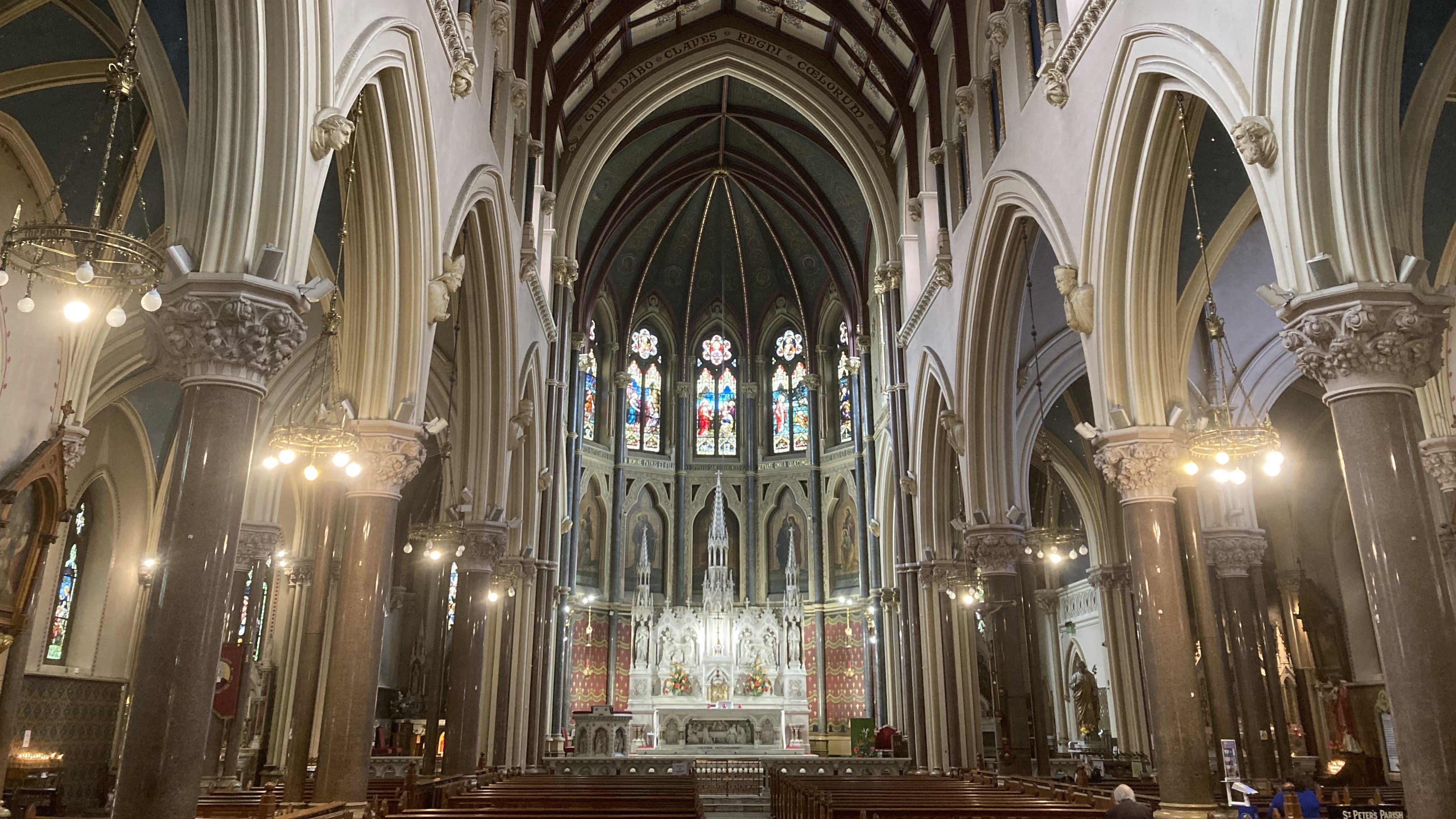 St Peter’s Cathedral is dressed from floor to ceiling in a pattern of cream and red and riotous emerald green. Light floods in from the clerestory, but whenever the doors are quietly opened or closed, the arcades tremble in a glow of candlelight. There’s a powerful tang of incense throughout the building, and several people sat apart in prayer as I arrived. Most were silent, but some were mouthing words noisily enough that I could hear their lips crackling.