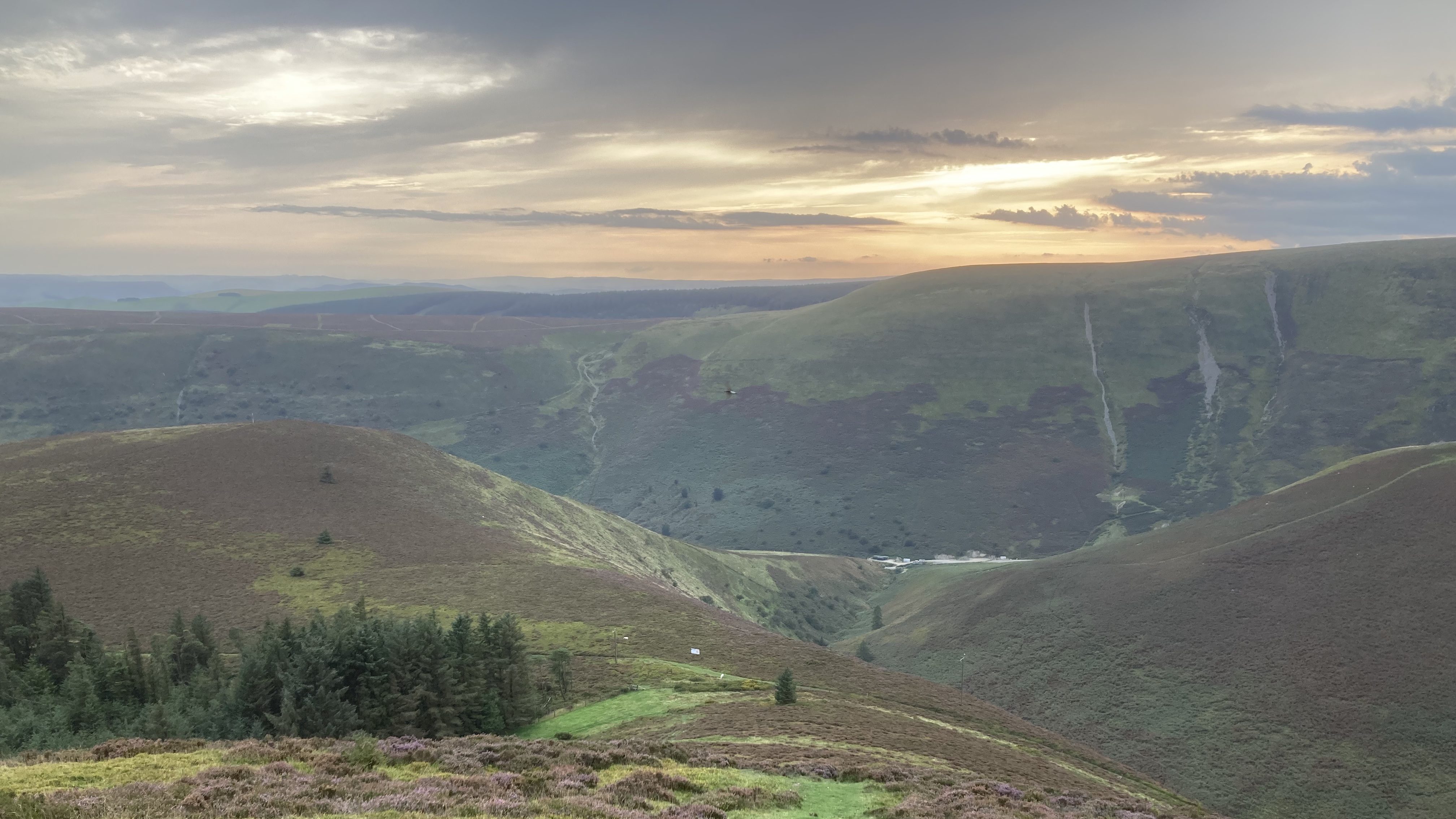 And the subject returned to haunt me while walking in Fforest Clud above New Radnor last week at the end of a stuffy, humid day. It’s a steep climb up the Whimble, but the hill offered some extraordinary views across the Marches and down to Pen Y Fan. After storms in North Africa, thousands of tonnes of Saharan dust swirled in the sunset, casting a red glow on the mountains beyond me. Many of these Radnorshire hills are flat-topped and they fall precipitously from their edges into a maze of steep-sided valleys. Against the effect of an orange afterglow, I felt like I was looking through the smudged-up windows of an antique furniture shop, making out the jumbled shapes of chairs and tables dressed with dust sheets.