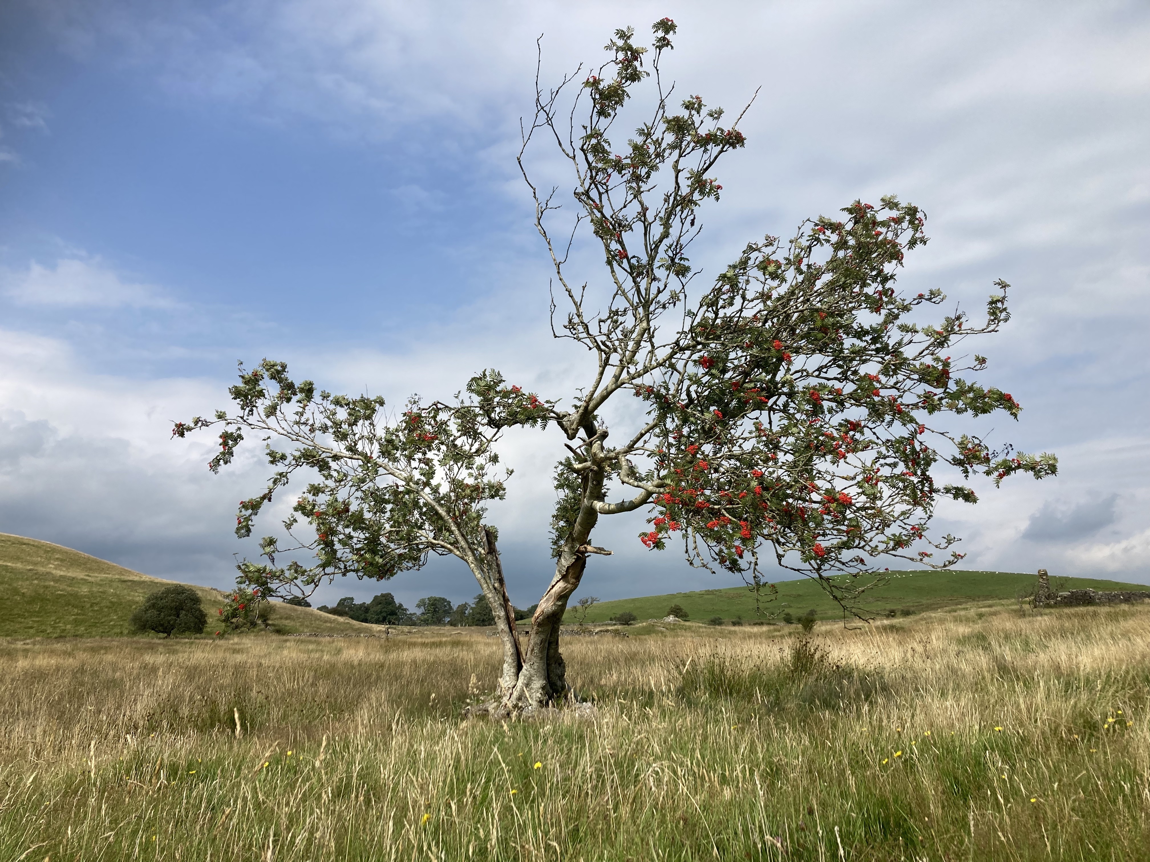 Between the drumlins, there’s a tangle of honeysuckle and hazel hedges which lead along cart tracks and out to a maze of tumble-down dykes. So much work and care has gone into the place over the years, and the fields cleared by hand for generations so now there are hand-sifted dumps of stone called bings in every margin – and on every bing, a wheatear revelling in the summer’s final flush of flying ants. A score of ancient crab apple trees stand above an outlay of ruined barns, and then the land descends into tussocks of molinia and bog myrtle. Small copper butterflies sparkle in the grass, and a stonechat watches them from an explosion of valerian.