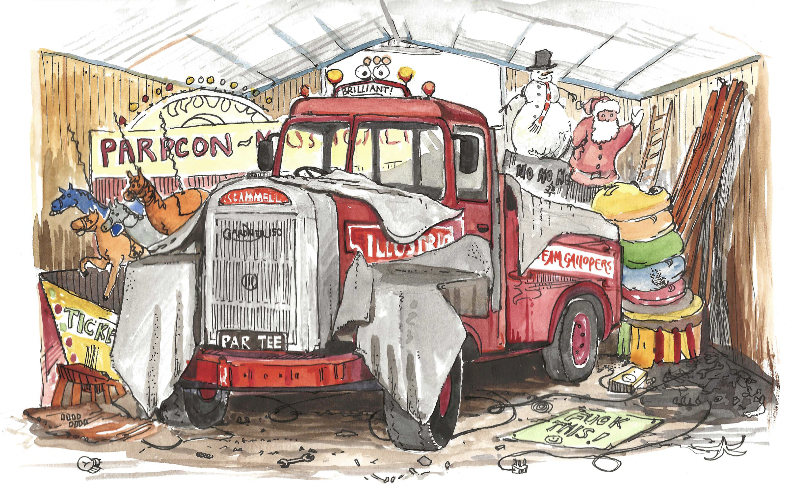 There were fibreglass clowns, hotdog boilers and candyfloss machines in the shelter of that shed – every frame and bar had coloured lightbulbs fastened to it; strings of bunting were underhung with cobwebs and sparrow nests; herds of bounding horses were heaped on upright poles like golfclubs. And within this gaudy cornucopia of delight and diversion, the practical parts of motors and machinery were exposed to view – the backside of confection; cogs and springs stacked in order of size and condition, while a city of car batteries charged and were supercharged amidst leafy heaps of discarded cigarette butts. Hardly caring about the truck I’d come to buy, I marvelled at a massive Scammell Gardner 150 lorry half hidden under dust sheets – the original Amusement Machine, complete with foghorns and batteries of brightly-coloured lamps and illuminations – because what is a travelling fairground without a workhorse to pull it?