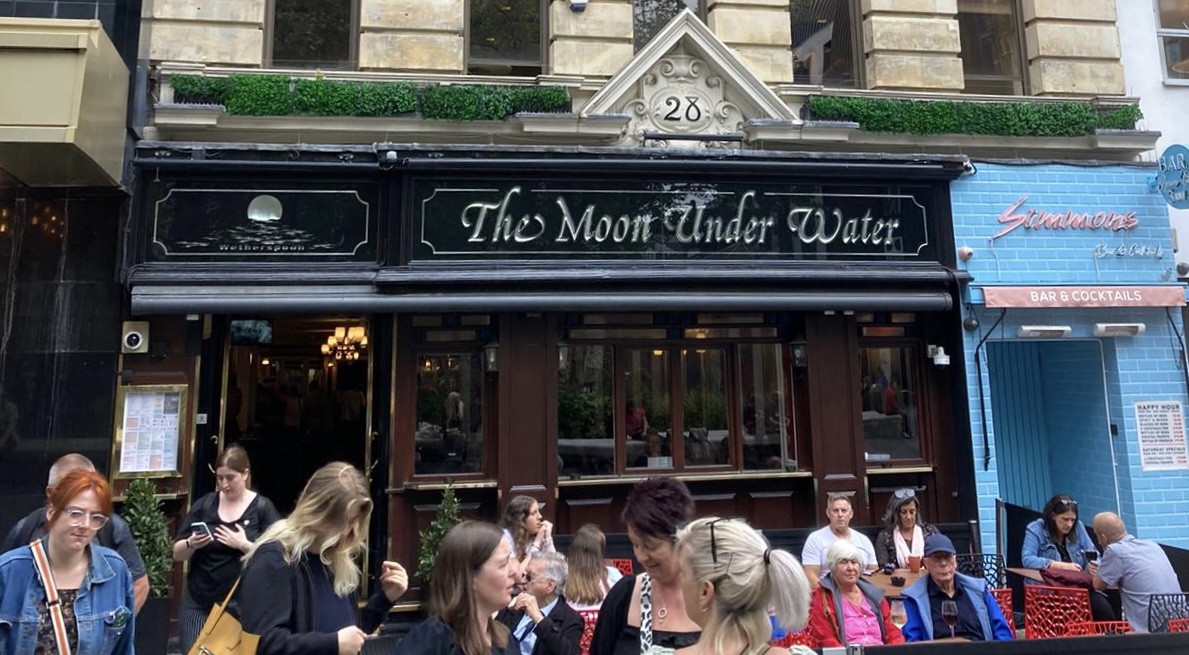 Orwell wrote about The Moon Under Water, “the perfect pub” which he imagined at length in an essay for the Evening Standard in 1946. He lays it on thick in that essay, which is the sum of a hundred personal predilections, described with the wisdom and knowledge of a pub connoisseur. By dialling up certain details and toning down others, Orwell conveys a vision of peace and companionship; motherly barmaids and beer served in pewter pots and mugs which have handles. There are no radios in The Moon Under Water, and tobacco, cigarettes and stamps are available to buy over the bar, along with dishes of liver-sausage sandwiches and mussels (which are a speciality of the house). It’s a fantasy, and I read his imaginings with a heavy sigh. After all, who would not like to visit a place so beautifully named; with the shimmer of light reflected on the movement of dark and calming eddies.