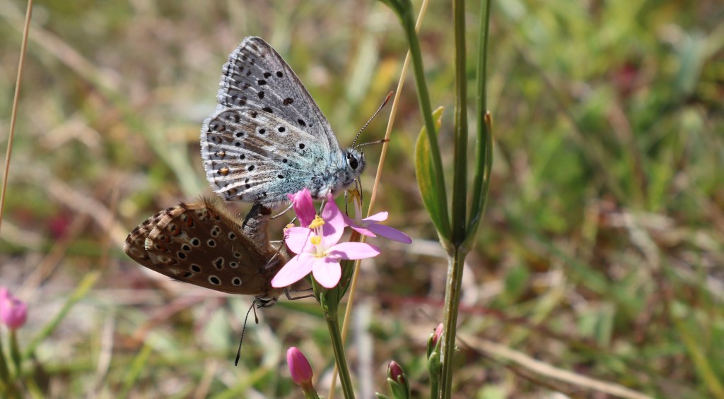 It was summer when I walked at the Devil’s Dyke, and the hawthorn trees were loud with blossom. Underpinned by flint and chalk, these Downs are unlike anything I’m likely to find at home. In the sun and the glittery blare of grasshoppers, the flowers were larger and more opulent than I could believe. Plants which I am used to seeing at the scale of a pinhead in Galloway were writ large as coins in Sussex, and a litter of butterflies tumbled between them. Many of these were familiar too, but somehow bigger and more expansive in the south, wearing their wealth more easily. Between the known excitements, there were chalkland blues and marbled whites as well; curiosities which fed into a fine spread of life in the tidy undulations.