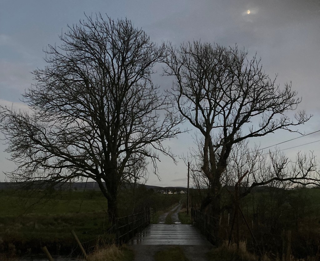 I left home early to be sure that my foot was first inside the door at Barmannoch. The last light lingered in the trees as I climbed the dyke and crossed the bank towards the old railway. It’s been seventy years since trains have passed this way, and now the line is overgrown with ash and sycamore trees. Badgers undermine the bankings, and the cuttings are coated with hart’s tongue ferns and the stumps of wild strawberry. I followed the line into a mild, dripsy kind of dusk; mist and chimney smoke pooled in the hollow where the town lies, and the land rose homely beyond it. As I turned from the track and climbed a gate for the open fields, a song thrush sang behind me – the first of the coming year. It was a quiet, uncertain sound in the gloom, and nothing like the full-bore richness of March and April. It’s still too soon for that grand performance, but the bird seemed to be saying “not this, but something like it” – and I did feel a sharp prickle of relief that things will soon be well again.