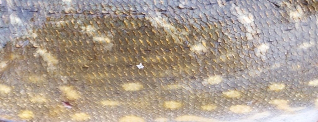 He’d come to a lure called a Flying C – a red rubber squid with a silver coin which flickers as it moves through the water. The first job was to see how deeply he’d taken it – but even the most distant suggestion of opening his mouth turned my stomach. His bottom jaw undershot his beak by an inch, giving his mouth a brutal, thuggish scowl. I knew that I should be careful, but there was something oddly soft and alluring in the outside ledge of his mottled jaw. It appeared to be smooth and tactile as a porcelain – but then he moved and showed me a stockade of white teeth as fine and jagged as blackthorn stegs. They seemed terrible, but as my pike gaped and gnashed his gums together, I was even more alarmed by the almost invisible furze of smaller teeth which lay in ranks and panels around his tongue and his cheeks. Even at a glance, these resembled a hybrid of splintered glass and burdocks; like a cat’s tongue, every single hook was rasping backwards into the throat from which no escape could be imagined. Like Kipling’s dingo, the pike grinned at me “like a coal scuttle”… and I quailed from him.