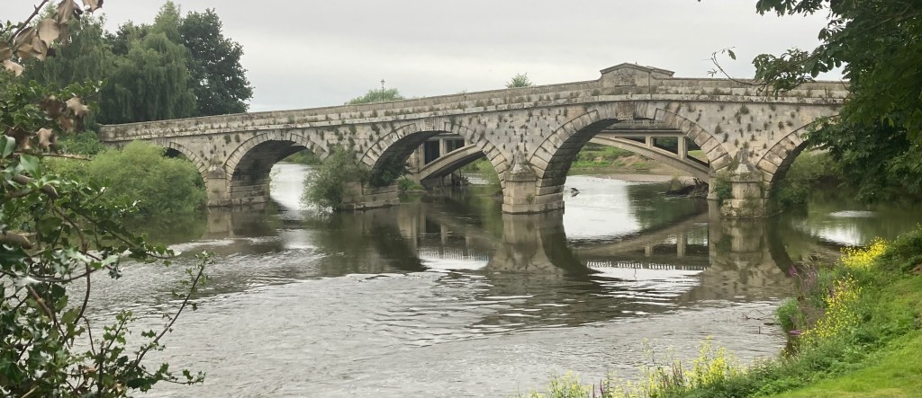 You can look vertically down to the water from one of two bridges which cross the narrows at Atcham. The view is mainly of ducks which gather and snooze on a curling bar of sand which has grown behind the bridges’ western piers. Not far downstream, the stonework of St Eata’s church is laid in mighty motley screeds of red and grey. In an English way, it’s beautiful there when the sky has thickened with swifts and swallows on the willow’s edge. Teams of young mergansers hunt beneath the banking where the graveyard falls suddenly into the river, and tiny landslides of erosion are gradually releasing the residues of long dead people to the water for the sea.