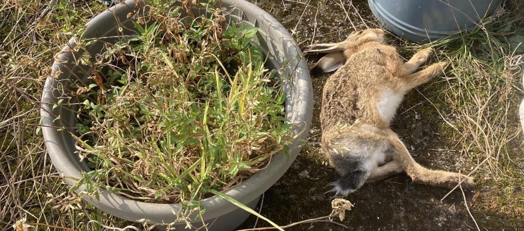 Then turning from the sudden crumble of summer, I found two hares lying dead in the garden. They were clean, immaculate young things, with no sign of violence, depredation or injury. Hares often die for a host of complex bacterial reasons, and it’s not unusual to find them dead or approaching their last gasp in the hedgefoot at this time of year. But it was jarring to find two in such close proximity, both discovered in the same gelatinous twilight… and if you were looking for portents and ill-omens, I suggest you take your pick from the selection above – because nothing is right here, and no consolation to be found in expectations of a crisp and rosy-cheeked trot into winter.