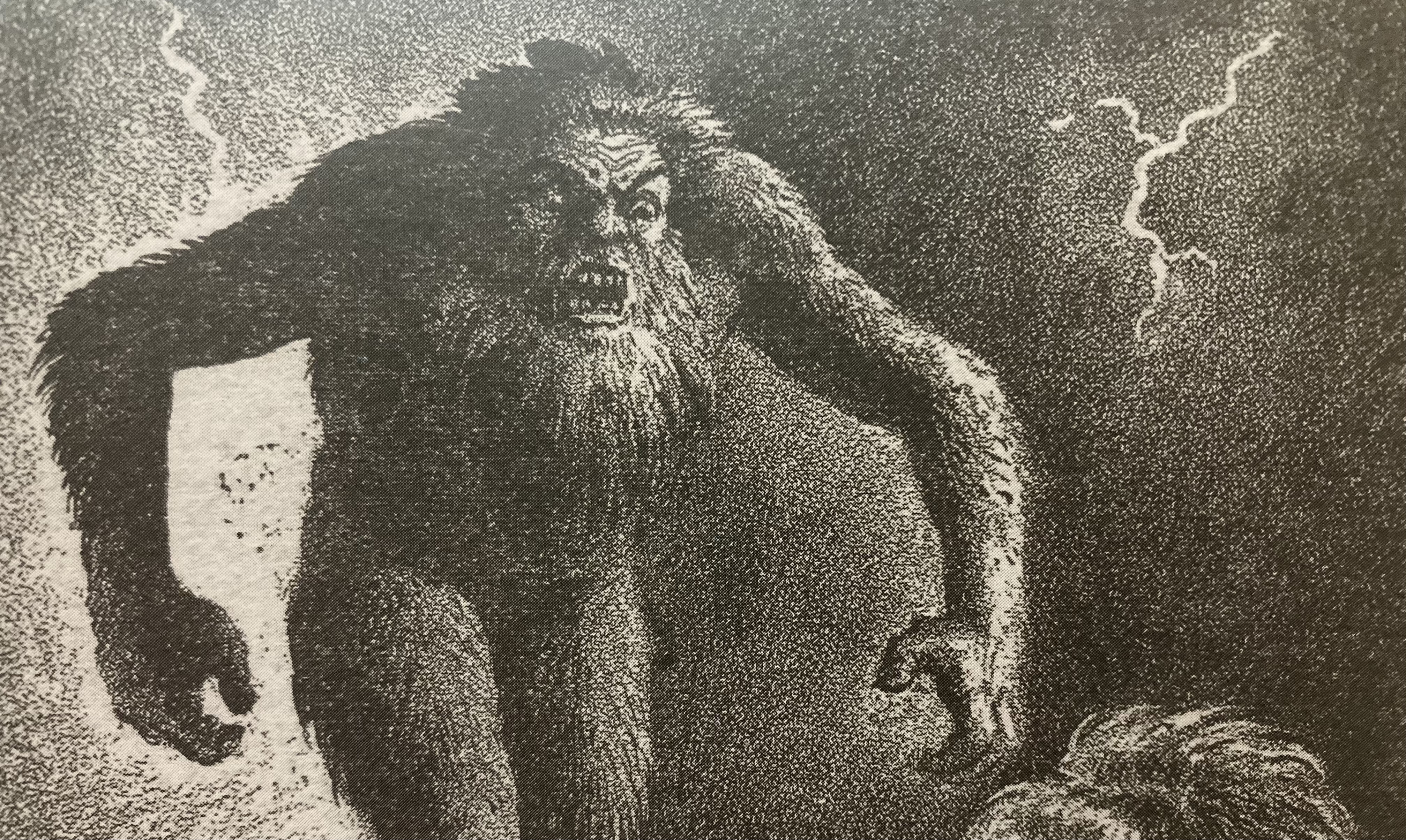 The premise of No Man’s Land is simple – a rising star of Celtic studies at Oxford University is tickled by the idea of a fishing holiday in the hills above Allerfoot, which sounds an awful lot like the high Glenkens. Staying in a shepherd’s bothy, he is immediately intrigued by a local superstition in which sheep are mysteriously stolen and lambs found mutilated with strangely inexplicable wounds. As the plot unfolds, it turns out that these far-flung “Galloway Hills” contain a population of ancient Pictish people, driven underground by thousands of years of persecution. And they’re not just culturally separate… they’re catastrophically bestial; small, sheep-eating cavemen with sharp teeth and nasty minds. Illustrated in 1949 by the artist Alexander Leydenfrost (above), the effect is ramped up still further; these are bloodthirsty ape-men, intent on murder and mayhem. The plot is secondary to some of the descriptive language, particularly in Buchan’s description of a Pictish elder “like a foul grey badger, his red eyes sightless and his hands trembling on a stump of bog-oak”. It’s all great fun, even though the action explodes into a multitude of immediately predictable angles.