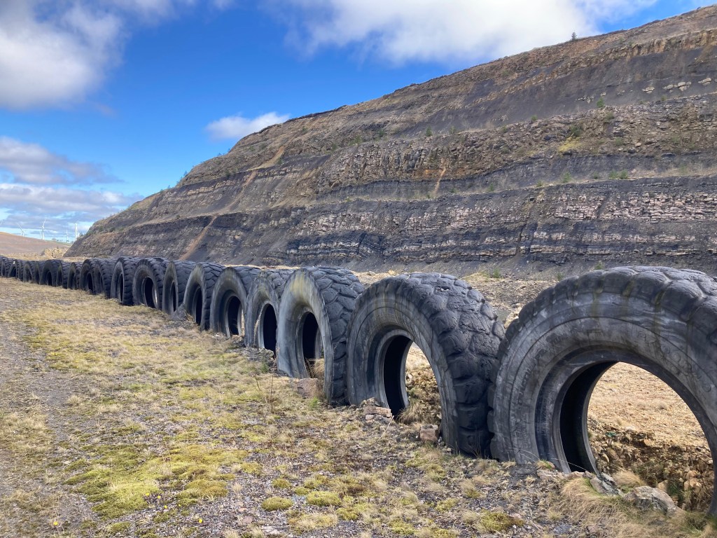 On the northern face, drab grey rock rears up in a smooth diagonal bank. It’s possible to make out a few scratches and mechanical scuff-marks in the living rock, but otherwise it’s a single, unsmiling sheet of stone. To the south, the opposing wall rises in alternating bands of black and white rock which have been opened up like a slice of cake in a pattern of giant steps. The black colour is coal and the white is limestone, here and there interrupted by volcanic intrusions and chimneys of cauterised rust. This is a complete geological record of Scotland’s coalfields – a back-catalogue of deep time which charts the progress of this place as it seesawed between inland seas, marshland and jungle for a period of around five million years. As I gaped at the scale of this place, a peregrine falcon circled against the cloud. Sandpipers called from the gaudy blue pools of water nearby, and the first wheatears of 2025 sang scratchy little songs from the cliffs overhead.