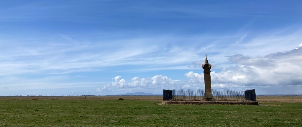 Skylarks sang above the monument as I approached it last week. Small flights of geese rearranged themselves in a bitterly cold wind as I walked. The Solway was being churned to white foam by that wind, and I watched the water tremble and buck across miles of sand-coloured seagrass and salting. This part of the Firth is a bizarrely enthralling flatscape, dotted with stunted gorse bushes and dominated by a strong and overbearing sky. To the north, Dumfriesshire looms in a surge of rising blues and rainshowers beyond Burnswark and out towards Langholm. The impressive bulk of Criffel stands to the west in a pattern of shapes and swellings which has often provided a surge of welcome reassurance after long trips away – it’s the first sign you can see of Galloway from the train windows or the motorway which brings you mercifully north and home again.