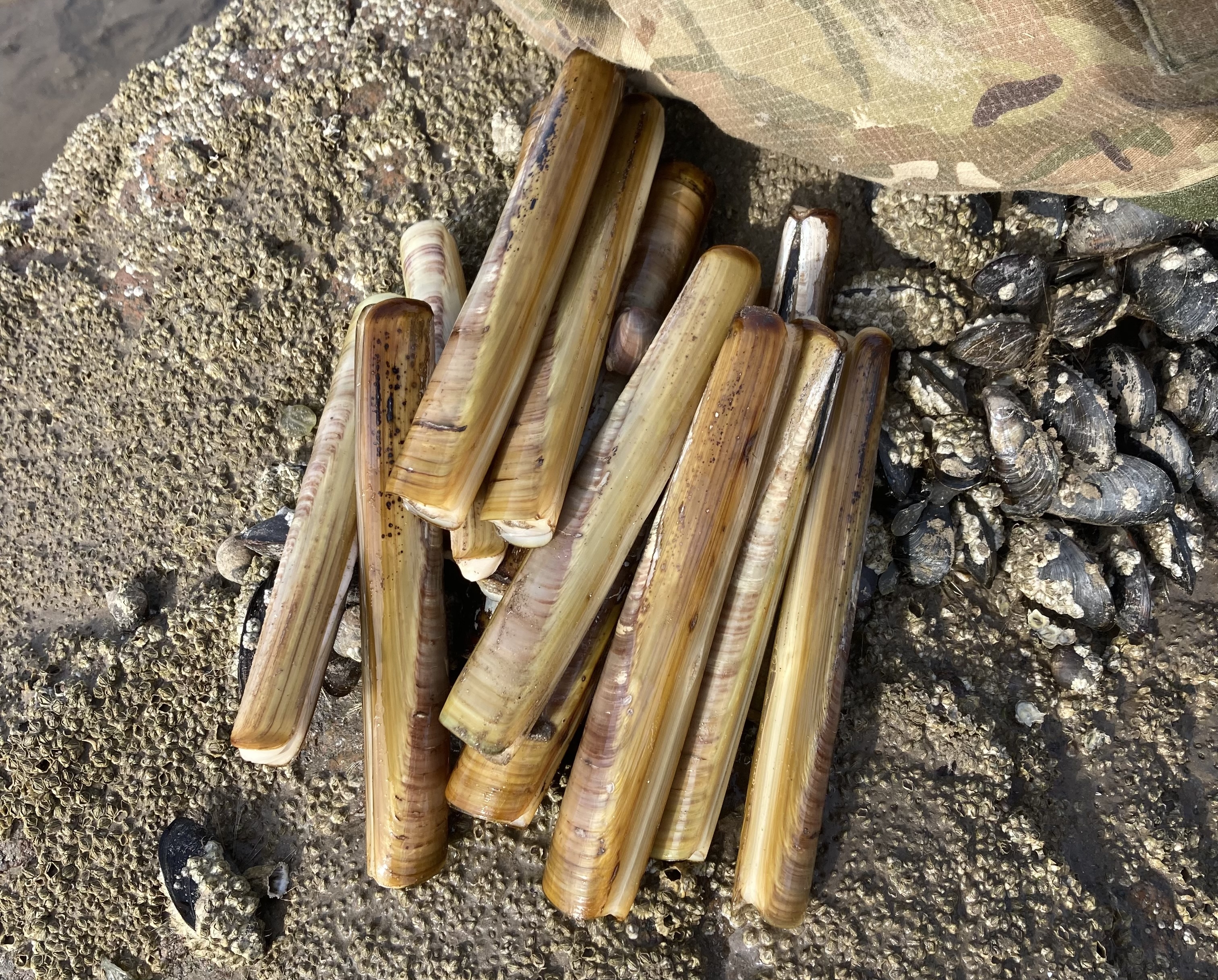 They were hard to see at first, and sometimes when the tide has fallen more steeply off into deeper holes, the work is altogether more easy because there are juts of shells and pointing ends to hunt for in the mud. No such hints on this cool morning in early April – and only the sudden spurt of seawater to catch our eyes, because as razor clams detect your movements nearby, they jerk suddenly down into the mud and conceal themselves. The squeeze produces a small ejaculation of salt water – and a hole which is very quickly backfilled by brine and sediment. That’s why we call these creatures “spoots” – the spout of water is like the bullseye of a hidden target, revealed for a moment in a squirt of salted lightness.