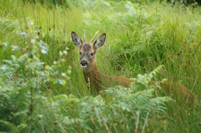 The movement is brief and might have been easily missed, but I have seen it. A roe buck is grazing gently above the water, slightly further out than I could throw a stone. And as I reach for the rifle by my side, he looks clearly up in my direction, flushed with the whiteness of his mask, more curious than afraid. At this range, I can see his antlers rising above the height of his ears like two slanting exclamation marks; straight beams with the dot for each eye.