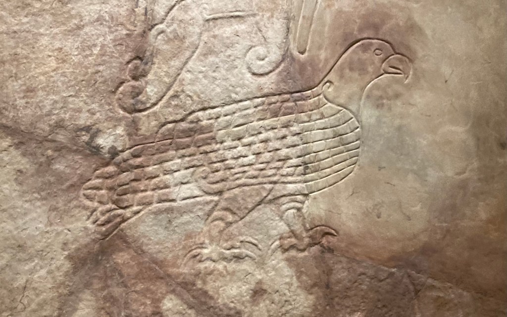 From Turkey to Mongolia, tamgas were carved into stones and branded onto goats and cattle to denote tribal property and boundaries – some were very simple and many were just a few lines in a certain arrangement – but others clearly represent animals and people. I found several of these tamgas on display at the National Museum of Kazakhstan in Astana, and the idea stays with me because a kind of tamga persist today in Ukraine where, since the Russian invasion, the national flag is often augmented with a stylised “trident” coat of arms. It’s not new – it’s a very ancient kind tamga based on the shape of a diving falcon – a relic of tribes on the Great Steppe.